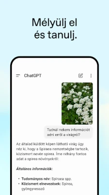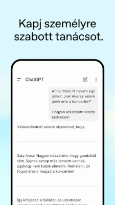 Élvezd az interaktív kommunikáció szabadságát a **ChatGPT** egyedülálló funkcióival. A Hang módnak köszönhetően elegendő megérintened a fejhallgató ikont, hogy beszélgetésbe elegyedj, legyen szó egy spontán esti meséről a családodnak, egy családi vita végére pontot tevő tényről, vagy útközbeni ötletelésről. A Fotófeltöltés funkcióval pillanatok alatt digitalizálhatsz egy kézzel írott receptet, vagy részletes információkat kérhetsz egy történelmi emlékműről a fényképe alapján, ezzel új szintre emelve a vizuális megértést.